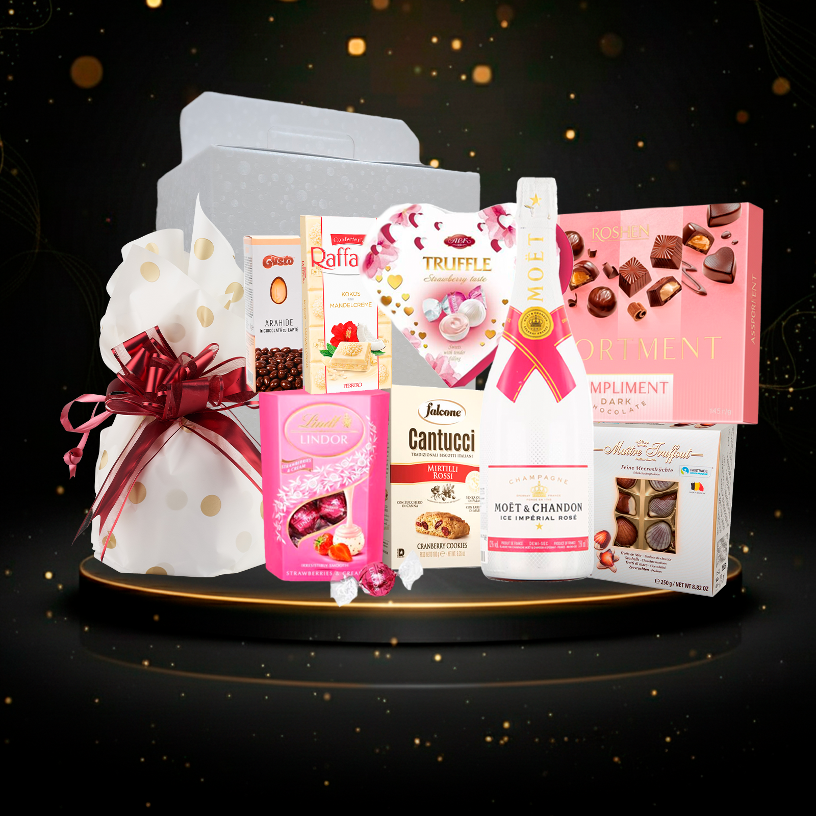 „Marry Me” este coșul cadou conceput pentru momentele în care cuvintele nu sunt suficiente și trebuie să vorbească gestul. Se bazează pe o combinație premium de șampanie Moët & Chandon Ice Rosé și selecții fine de praline, biscuiți și deserturi delicate în nuanțe de alb și roz.
